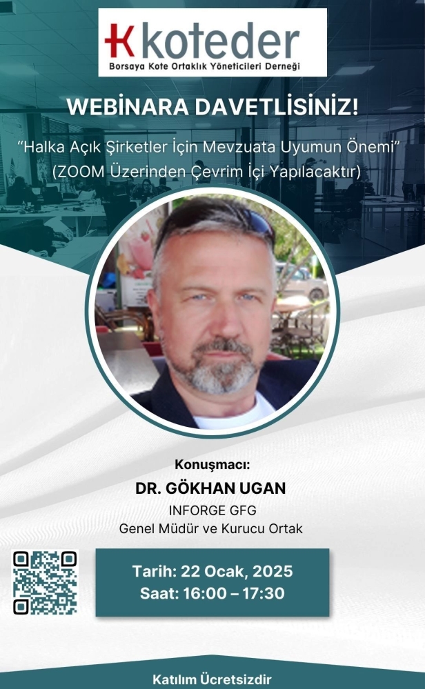 Üye ve paydaş şirketlerimizin "Uyum Riski"nden nasıl kaçınabileceklerini konunun uygulamacı uzmanlarından olan Dr. Gökhan UGAN anlatacak. 22 Ocak 2025 Çarşamba günü saat 16:00-17:30 arasında zoom üzerinden çevrimiçi olarak gerçekleştirilecek webinara katılım ücretsiz olup, webinarda ele alınacak konular ile konuşmacının özgeçmişi ve katılım bağlantısı aşağıda yer almaktadır. Katılımcı sayısı kontenjanla sınırlıdır.